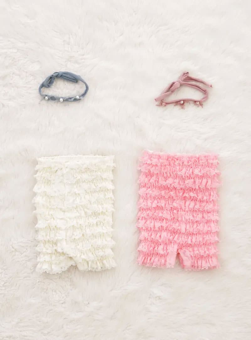 ふわふわのフリルがたっぷりついた、ニューボーンフォト用のロンパースセットです。アイボリーとピンクの2色があり、その日の雰囲気や背景に合わせて選べます。やわらかいレース生地で肌触りも優しく、新生児の敏感な肌にも安心。セットにはそれぞれのカラーに合わせたヘアアクセサリーが付いていて、頭にちょこんとつけるだけで可愛さ倍増です。ガーリーで華やかな雰囲気の写真を残したいときにぴったりのアイテムです。