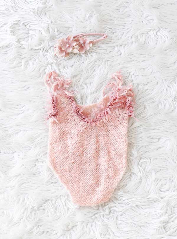淡いピンク色のふわふわした素材でできたベビー用のロンパースです。 胸元にはフリルがあしらわれており、頭には花の飾りが付いたヘッドバンドがセットになっていて女の子らしさがありとても可愛いです。