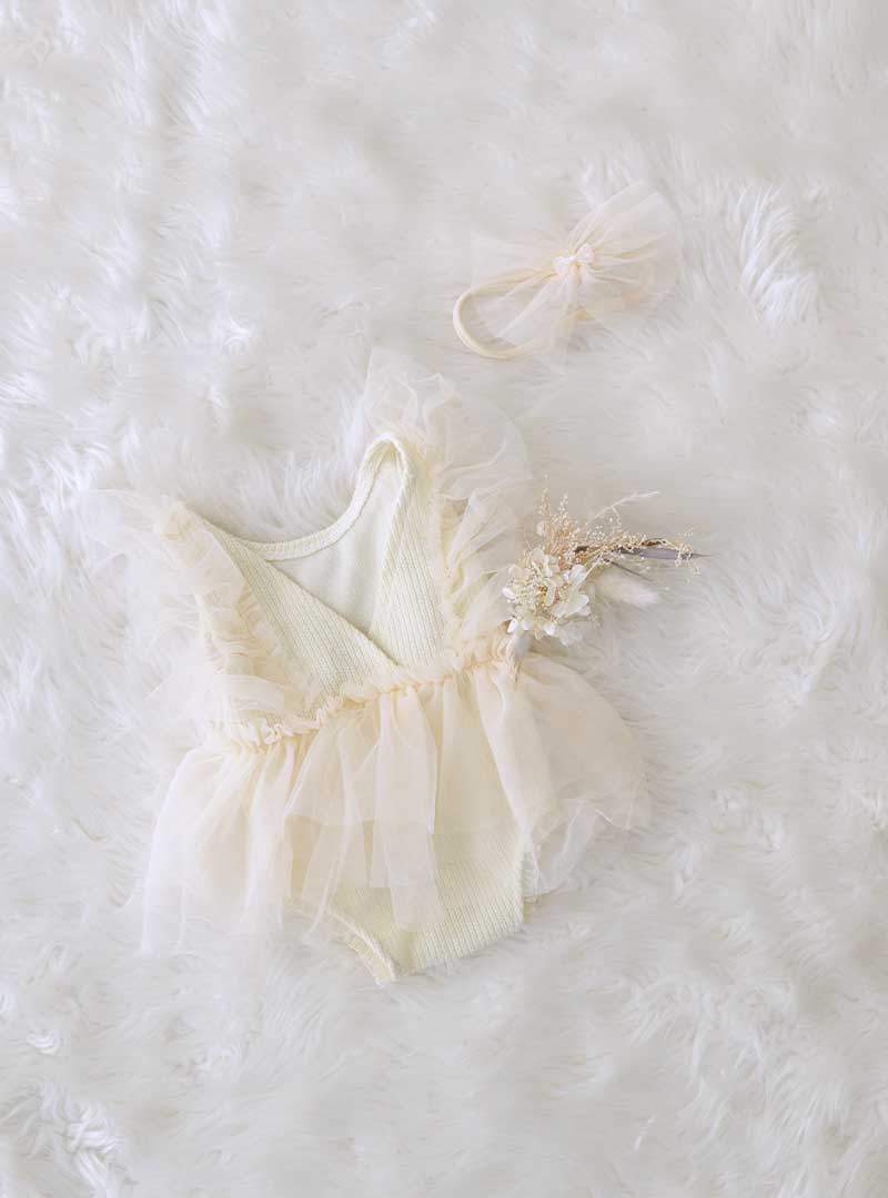 やわらかなチュールと淡いカラーが愛おしい女の子のためのニューボーンフォト衣装 小さなリボンを添えてまるで妖精のような可愛らしさを表現します。
