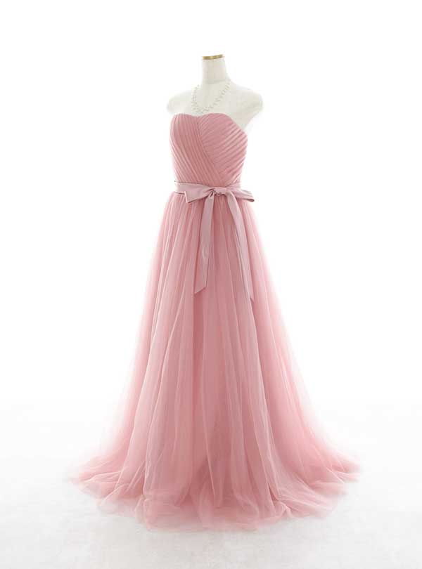 ロマンティックでフェミニンなデザインが魅力のドレスです。やわらかなピンク色のチュールが、優雅な雰囲気を演出します。 ンプルで洗練されたストラップレスのトップは、斜めのプリーツが特徴的で、美しいシルエットを引き立てます。ウエストのサテン地リボンがアクセントとなり、全体のバランスを美しくまとめています。