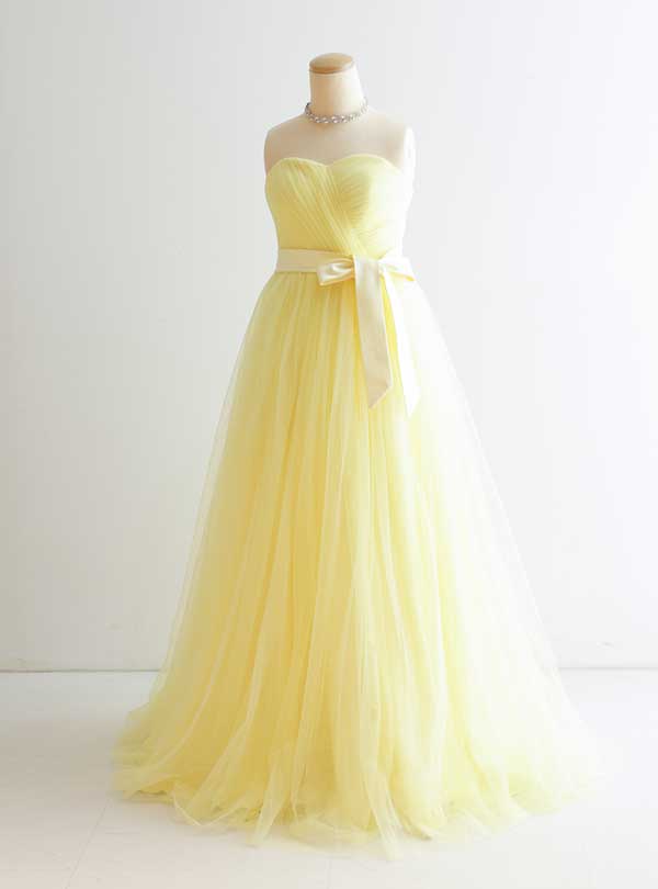明るく爽やかなイエローが特徴の1着です。ビスチェ部分には斜めのプリーツが施されており、優雅に広がる軽やかなチュールが洗練されたシルエットを作り出します。 ウエスト部分の同色のリボンが全体のデザインに統一感をもたらします。華やかなシーンにぴったりのデザインで、明るいイエローが元気な印象を与えてくれます。