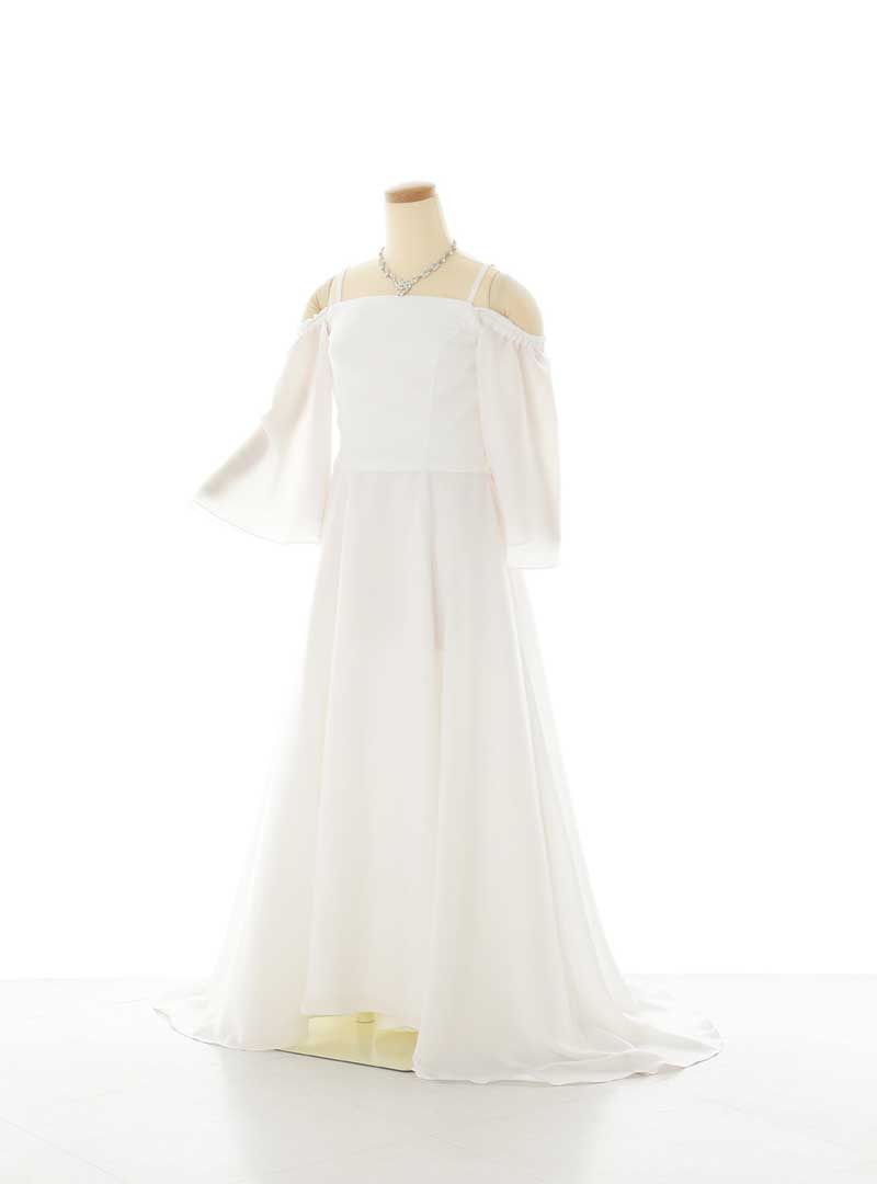 ワンカラーのシンプルで大人のドレスでは珍しく足元が見えるタイプなので可愛らしく、スカートの部分はボリュームが少なめなのでナチュラルな雰囲気です。肩回りは隠すこともオフショルにすることも可能となっておりますので2パターン楽しんでいただけます。肘の辺りまでふんわり腕が隠れたデザインなので他のドレスに比べても露出範囲が少ないのが特徴です。