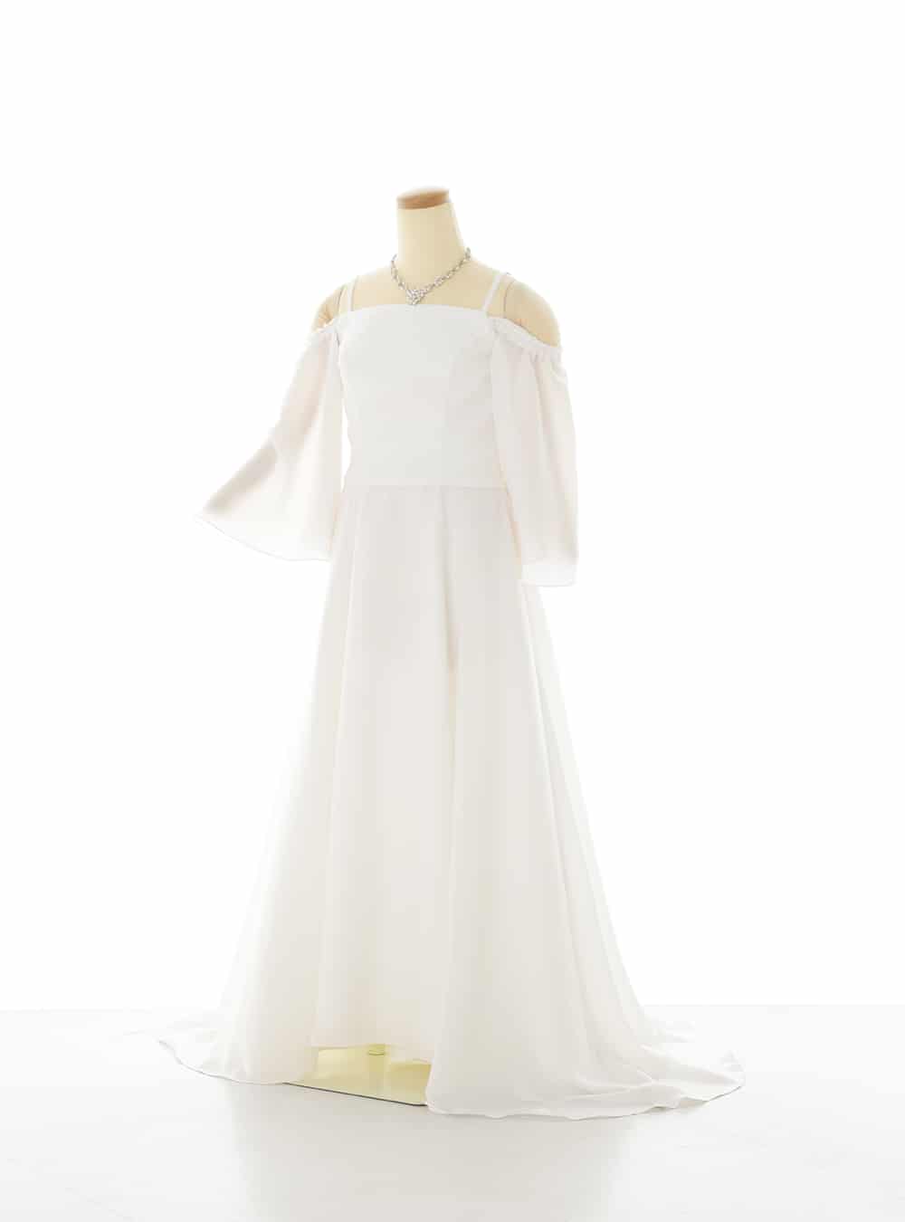 ワンカラーのシンプルで大人のドレスでは珍しく足元が見えるタイプなので可愛らしく、スカートの部分はボリュームが少なめなのでナチュラルな雰囲気です。肩回りは隠すこともオフショルにすることも可能となっておりますので2パターン楽しんでいただけます。肘の辺りまでふんわり腕が隠れたデザインなので他のドレスに比べても露出範囲が少ないのが特徴です。