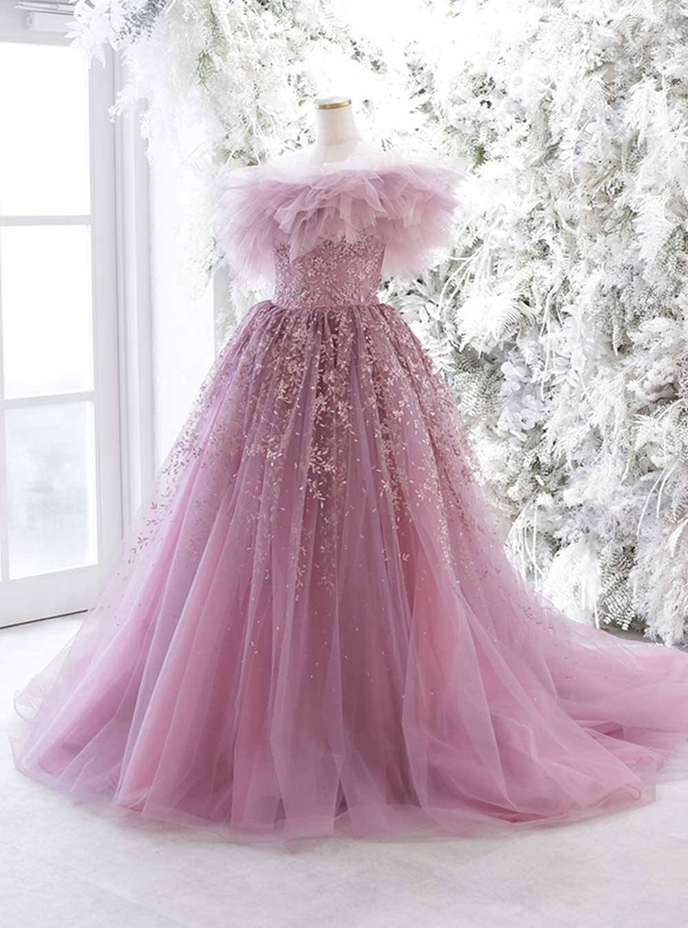 くすみピンクに華やかなラメが無数に散りばめられた、とても豪華なデザインのドレス。ピンクのドレスはとても可愛らしいイメージですが、絶妙な色合いなので普段ピンクをお召しにならない方でも挑戦しやすいお色味です。胸元のフリルは取り外し可能なので、すっきりとしたシルエットで着る事も出来ます。撮影の途中で取り外して1着で2パターン撮影できるのも人気のデザイン。
