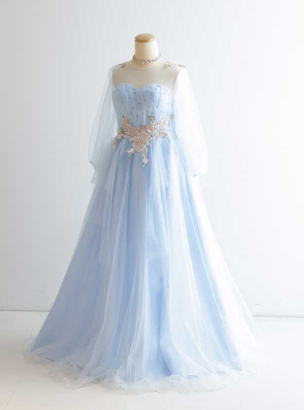 まるでおとぎ話のプリンセスのような幻想的でロマンティックな一枚です。ビスチェスタイルのトップスに長袖のシアー素材を重ねたデザインが特徴です。胸元からウエストにかけて施された繊細な刺繍とビーズの装飾がエレガントで華やかな印象を与えます。 透け感のある長袖とボリュームのあるスカートが絶妙に組み合わさり、幻想的な雰囲気を演出します。