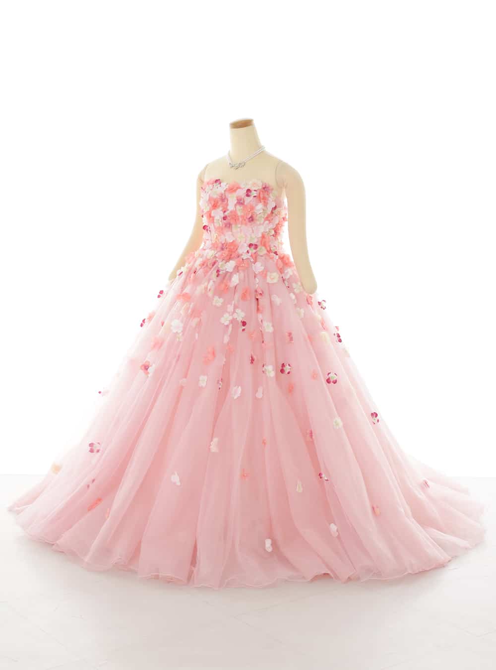 全体に沢山のお花が装飾されています。ボリューム満点のプリンセスラインのドレスなので可愛い雰囲気が好きな方にピッタリ!胸元が広く空いているのでヘアアレンジはアップスタイル、ダウンスタイルどちらでもOK! アイシャドウやチークなどメイクのカラーもピンクにすると統一感も出ます。全体的にゆるふわなのでプリンセス気分で撮影することができ、お花の背景にピッタリ♡