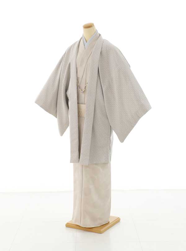 洗練された淡いベージュのトーンで、上品かつ落ち着いた印象を与える一着です。羽織には七宝柄が施され、柔らかな質感が優雅さを引き立てます。全体的に控えめでありながらも、細部にまでこだわりを感じさせるデザインが特徴です。 帯と着物の色合いが絶妙にマッチしていて統一感があります。ご家族で淡色コーデを希望の方にはとっておきの一着です。