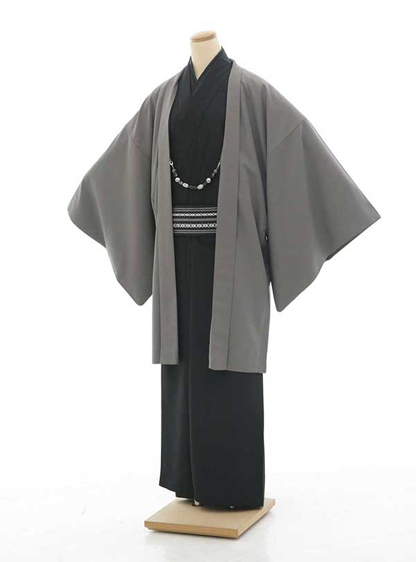 伝統と現代の洗練が融合した一着です。落ち着いたグレーの羽織とシックな黒の着物が、上品でありながらも力強い印象を与えます。細かいドット柄が施された着物は、さりげない華やかさを持ち、アクセントとしての効果を発揮しています。 また、羽織の無地のデザインが全体のバランスを引き締め、落ち着いた大人の雰囲気を演出します。