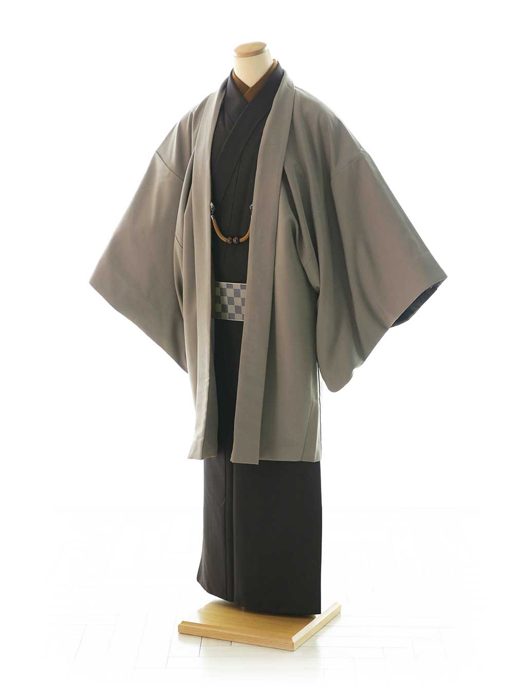 シンプルかつ洗練されたデザインが特徴の一枚です。全体的にシックな黒を基調としており、上品で落ち着いた印象を与えます。羽織は淡いグレーで黒とのコントラストが美しく、全体のバランスを保っています。帯はモダンな柄が施され、シンプルな中にもアクセントを加えてくれます。 羽織紐も着物と同系色でコーディネートされており、着姿を美しく引き立たせてくれるデザインです。