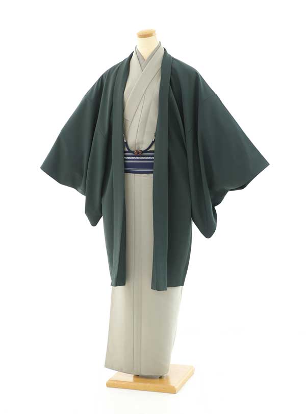 緑がメインカラーの着流しタイプの着物です。淡い緑の着物に深めの緑を合わせたシンプルな着物で帯の紺色がポイントカラーとなっております。淡く優しい色味なので、淡い着物や明るい色味の着物を選んだお子様と雰囲気が合います。 デザインがシンプルなのでお子の衣装と合わせやすいのでおすすめです。約170㎝~175㎝の方にぴったりの着物です。