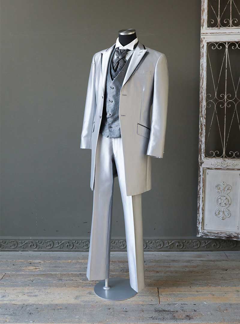 ジャケットのVゾーンを高めにしたことで足元を長く見せるロングタキシード華やかな光沢感を持つ素材を使い、ラペルやベストにブラックを入れる事でシックな印象にまとめました。2連のベストがシンプルな中に華やかさを加味してくれるので、地味すぎず派手すぎないバランスの良い1着。花嫁様のどんな衣装にも合い王道がお好きな方におすすめです。LLサイズで高身長さんにもお召しいただけるタキシードとなっております。