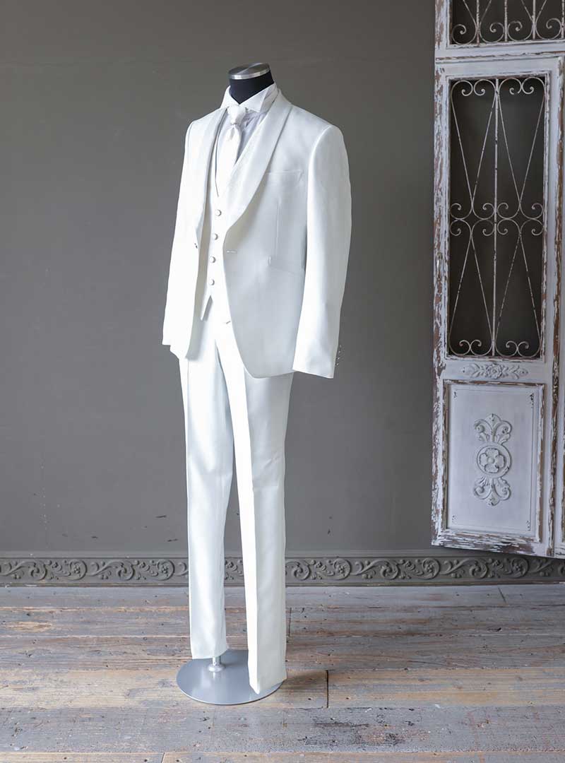 ホワイトで統一された正統派タキシードです。サテン生地なので高級感があり、シックな雰囲気に仕上がります。華やかな光沢感で式服としての格調もあり、グッと引き締まった印象をプラスしてくれます。ネクタイと蝶ネクタイお好きな方お選びいただけます。白のウェディングドレスと合わせていただくと統一感が出て王道なブライダルフォトを撮りたい方におすすめです。