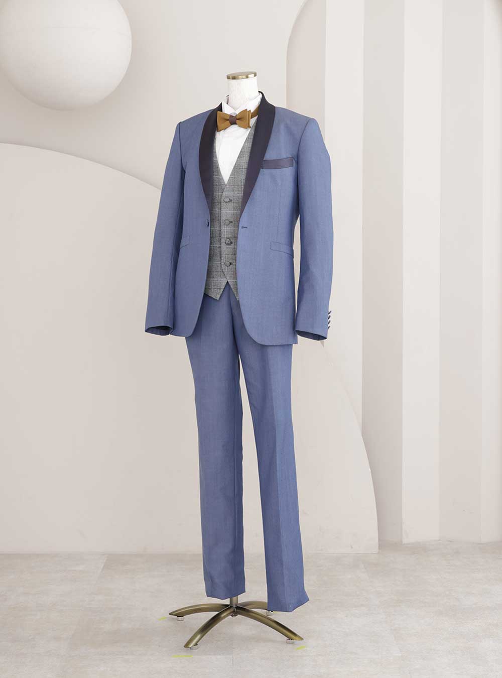 鮮やかなブルーが柔らかい印象をもたらしショールカラーの丸いシルエットが、さらにやさしさやソフトな雰囲気を醸し出す。ビジネススーツのジャケットでは見られないデザインで特別な1日をより一層感じられる主役にぴったりな1着です。ベストのチェック柄とマスタード色の蝶ネクタイがオシャレさも演出してくれる。可愛い雰囲気がお好みな花嫁様に合わせると相性◎