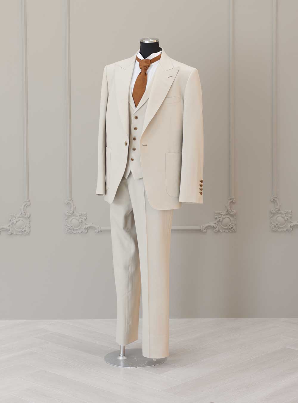 ベージュカラーのカジュアルな素材がラフな印象で個性を引き立ててくれる。ピークドラペルが肩幅を強調し、よりフォーマルな印象を醸し出しシャープな襟の形状が華やかさを演出してくれます。ボタンとネクタイの色を合わせることでシャープな中にオシャレさが加味される。地のベージュとポイントに使われているレンガ色が、全体の雰囲気を暖かく包み込みマイルドな印象に。