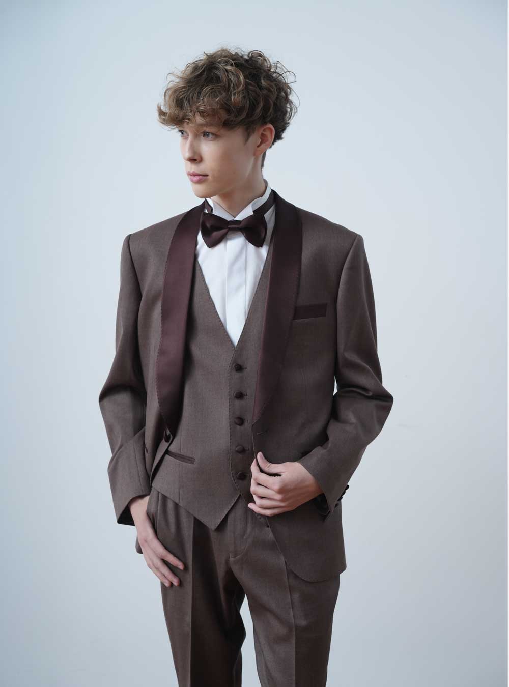 落ち着いたトーンのブラウンが魅力的な一着です。シックで洗練されたデザインが大人の魅力を最大限に引き出してくれます。ショールカラーがさらに深みのあるブラウンで全体を引き締めているので華やかさと落ち着きの両方を兼ね備えています。シンプルながらも体にフィットするように計算されたシルエットがスタイリッシュな印象を与え、自信に満ち溢れた雰囲気を演出します。