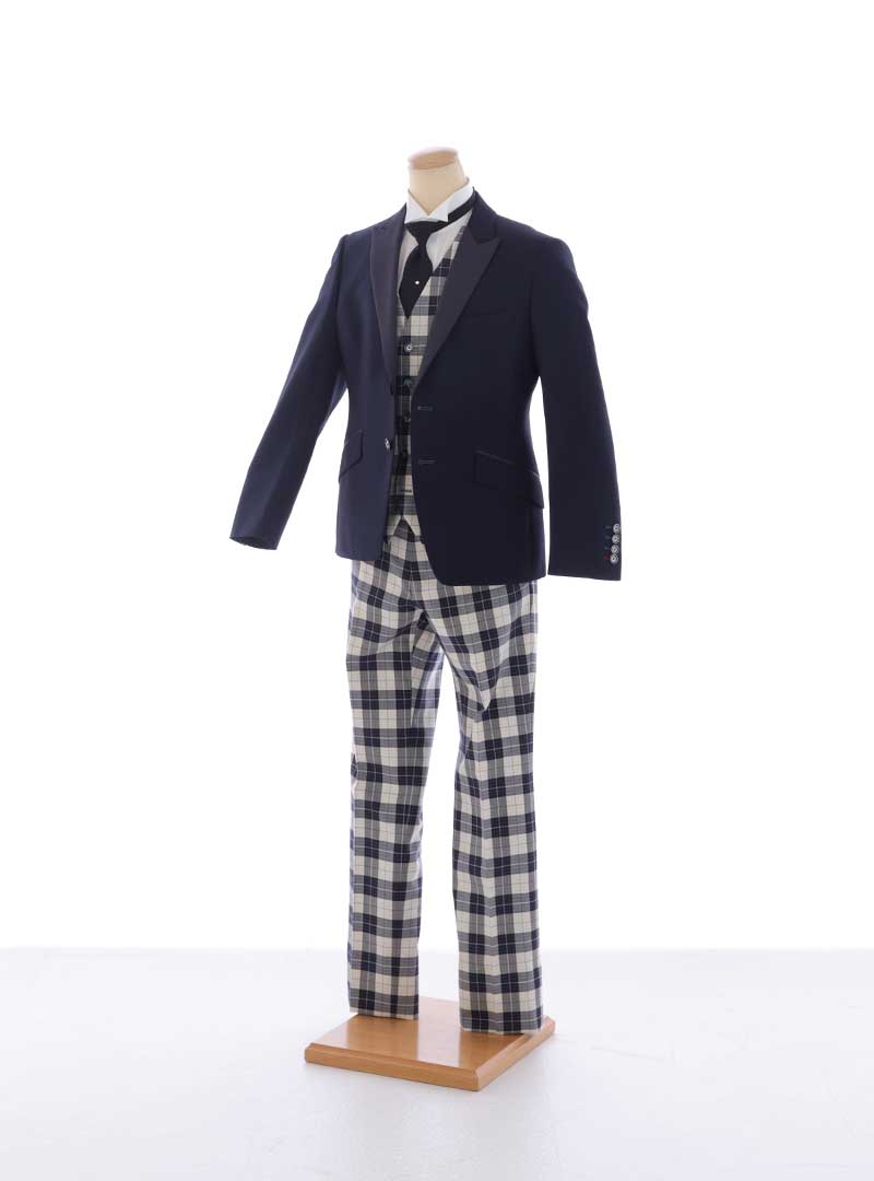クラシックなネイビージャケットに、存在感のあるチェック柄のベストとパンツを合わせたスタイリッシュなセット。 上品さの中に遊び心を感じさせるデザインで、カジュアルなロケーションやスタジオ撮影でも抜群の写真映えを叶えます。 モノトーンベースのチェック柄が洗練された印象を与え、他とはひと味違うおしゃれなウェディングフォトを演出します。