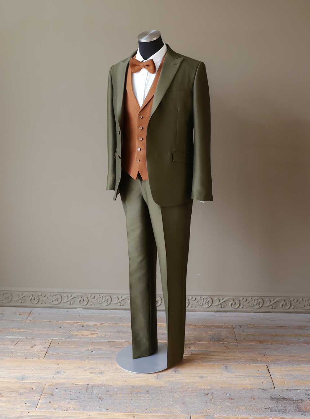 近年、アパレルシーンでも人気のカーキカラーがフォーマルシーンにも登場! ベストの差し色にテラコッタを入れることでよりトレンドを感じるデザインに。 衿付きのベストで上着を脱いでもフォーマルな格調を崩さずお召いただけるのも魅力のひとつ。 花嫁とペアでお召しいただけるデザインのタキシードで、二人でコーディネートを揃えての撮影をおすすめします。