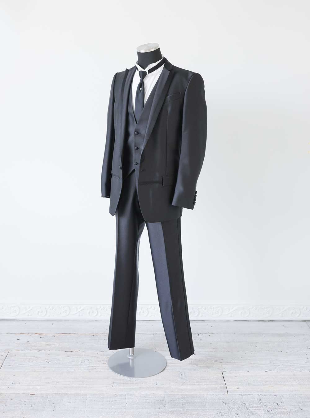 最上級の品格をもつブラックで統一された正統派タキシードです。純白のウェディングドレスと並ぶと更にグッと引き締まりクールな印象に仕上がります。シンプルかつシックな雰囲気が出るので、大人っぽくシンプルに仕上げたい方にオススメです。パンツのサイドに入ったラインと、お膝が引き締まるシルエットにより、かなりスタイルが良く見えます。