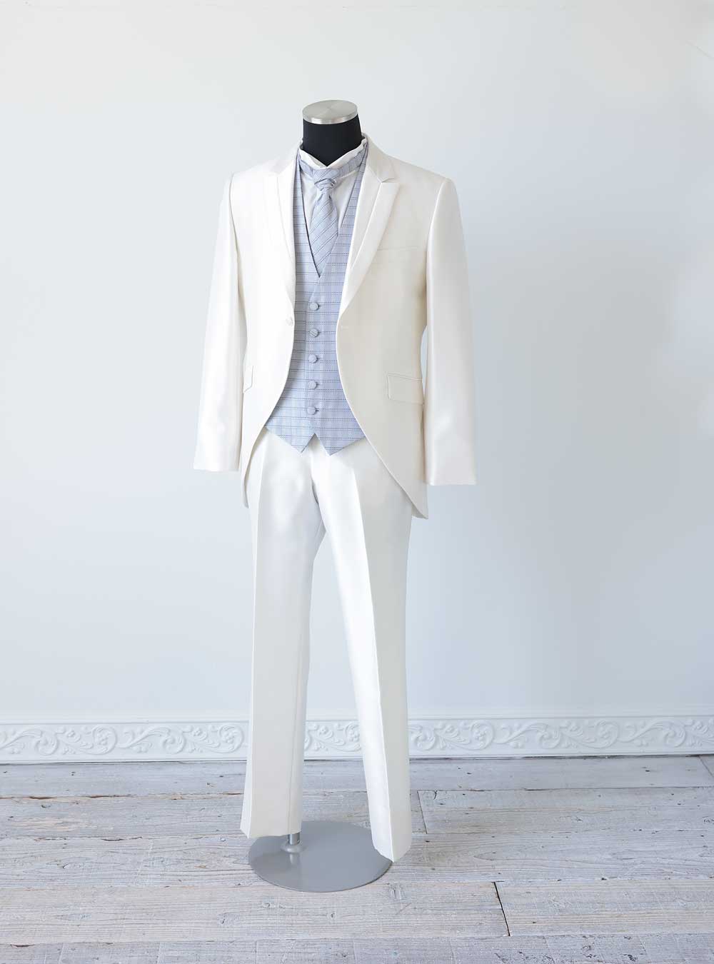 グレンチェックのベストと蝶ネクタイがお洒落なタキシード。 明るいベージュカラーがフォーマルシーンを少しだけカジュアルダウンさせてくれます。 ベストと蝶ネクタイはリバーシブルで、ブラックストライプでがらりと印象を変えてお召しいただく事も可能です。 花嫁様のお色直しの際に、ベストと蝶ネクタイを変えて雰囲気を変えるのがおすすめ!