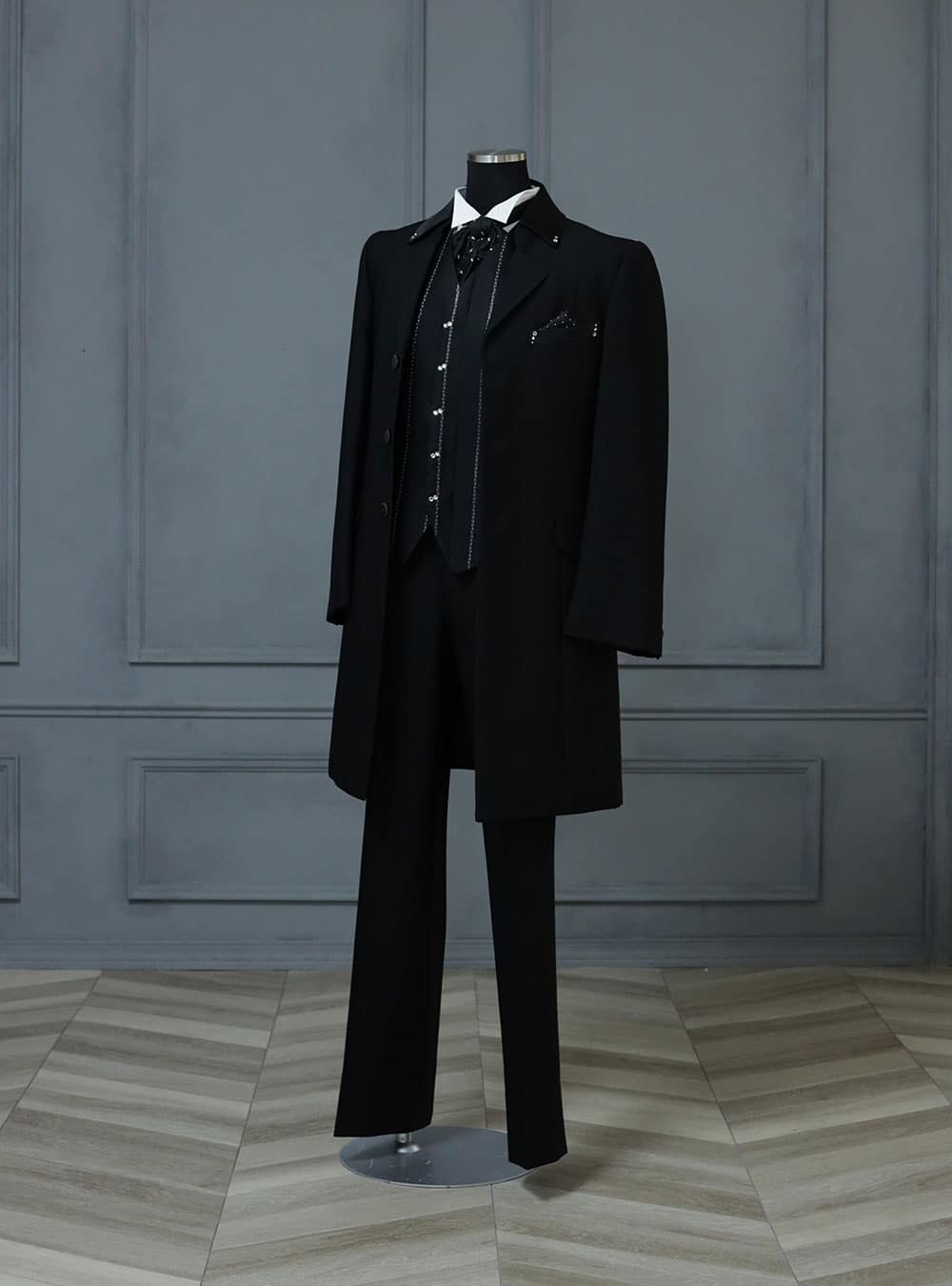 ブラックのロングタキシード。ベストとジャケットにはビジューが施されており高級感のあるデザインとなっています。 一方でアスコットタイがフォーマルシーンを、程よくカジュアルダウン。ロングコートのジャケットが、縦ラインを強調しよりスタイリッシュな印象を与えてくれます。高身長の方に特におすすめのタキシードです。