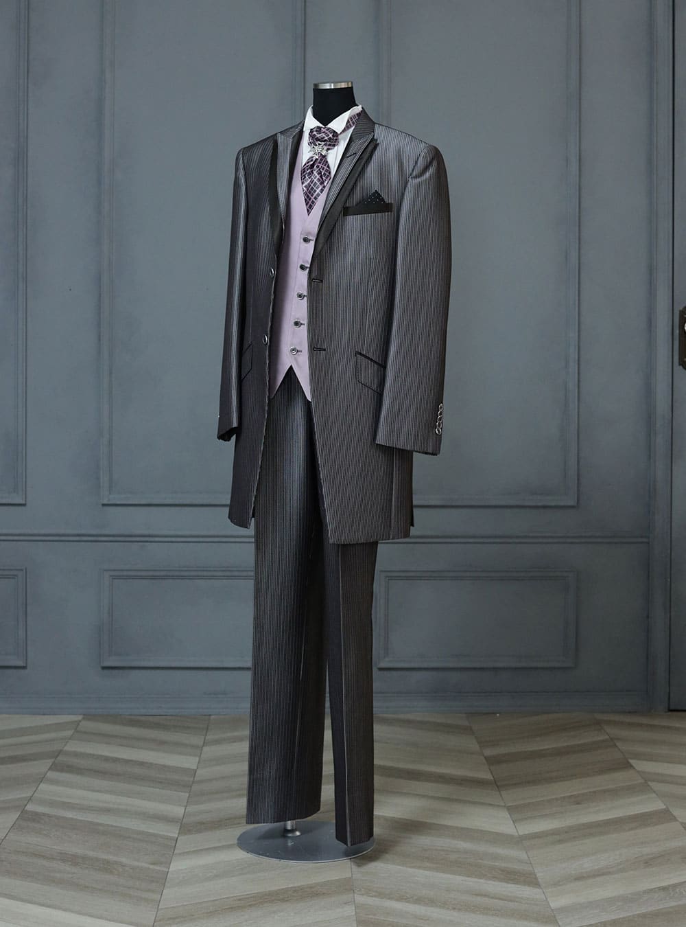 細身のスモーキーショコラカラーのロングタキシード。ブラウンとグレーを合わせたようなシャンブレーの生地は他にない絶妙なカラー。 ベストのパープルピンクがアクセントとなり上品で美しいスタイリングになっています。ラベルにラベルを挟み込んだ襟元のディティールが特徴のデザイン性の高い一着となっています。