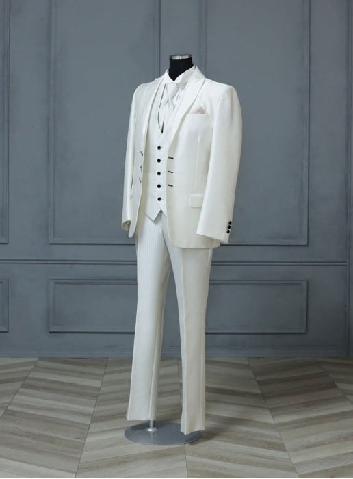 見る角度によりストライプが見え隠れするオフホワイトのタキシードは特別な日の一着に相応しい華やかな装い。 更にベストはリバーシブルタイプになっており、ブラックとホワイトの千鳥格子柄でモダンな印象にも変えてくれます。花嫁様のお色直しのタイミングでベストをチェンジすることもできるので、機能性も抜群です。