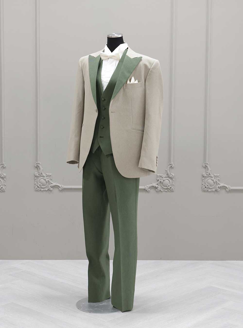ジャケットはナチュラルテイストのカーキベージュで濃いグリーンのパンツがコントラストをつけるタキシード。蝶ネクタイとリンクしたポケットチーフはにはバラ模様があしらわれ細部までこだわった一着です。 カジュアルな中にも上品な趣のあるタキシードです。憧れのガーデン空間で幸せいっぱいの二人をナチュラルに撮影することができます。