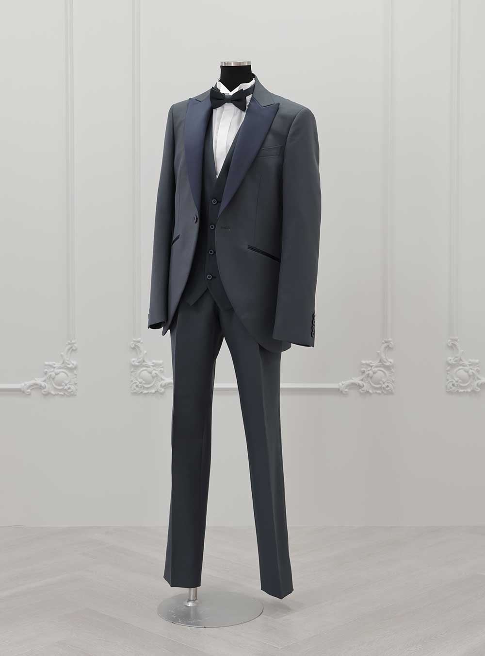 やや光沢感のある青みグレーのタキシード。ジャケットやパンツと異なる素材のテーラードカラーで素材感の違いもお楽しみいただけます。 ベストやネクタイもクセのない同系色でまとめ、落ち着いた印象のネイビーカラーでコーディネートされている。ウェディングドレスにもカラードレスにもマッチするデザインのタキシード。