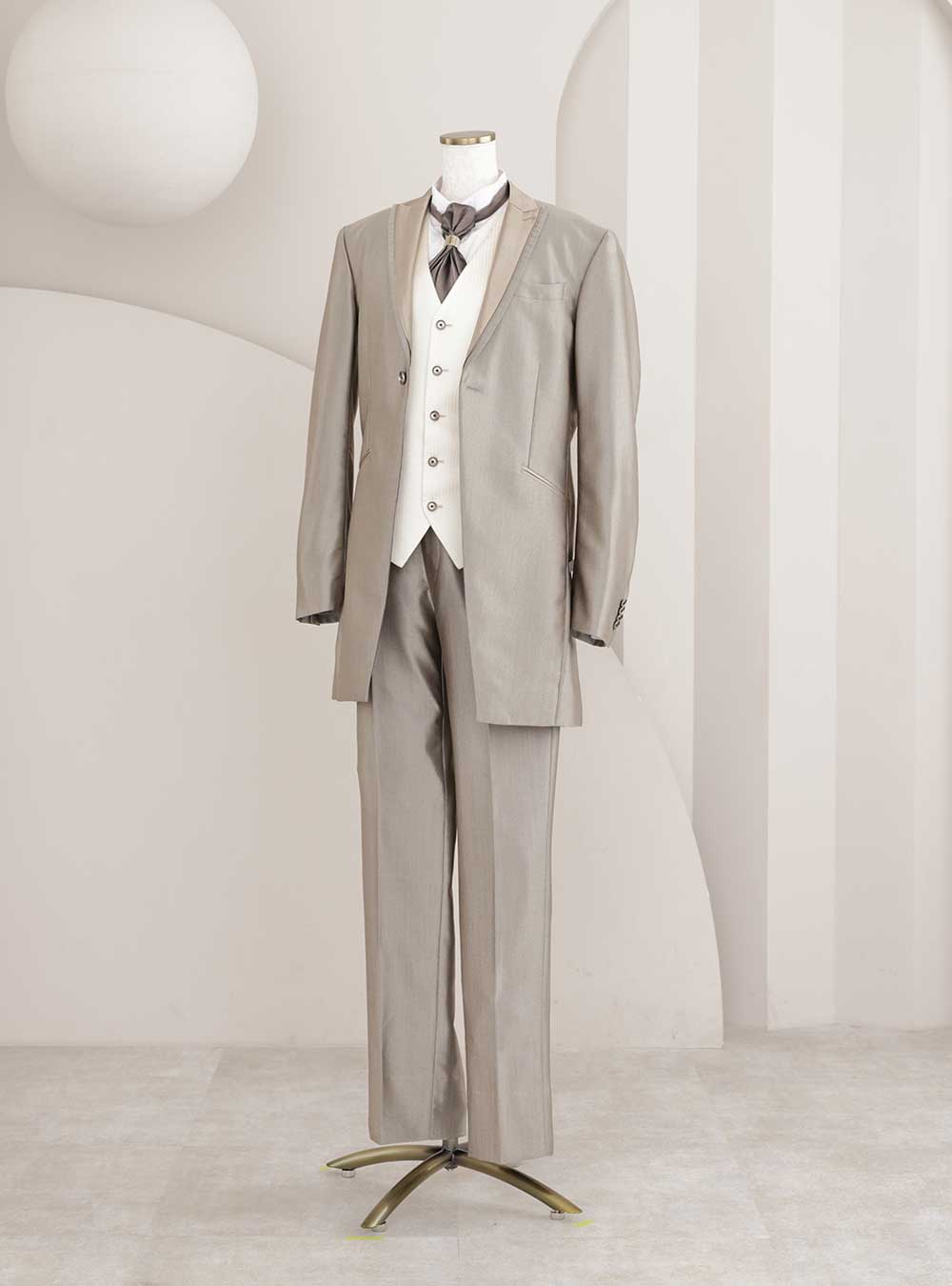 華やかな光沢感で式服としての格式もある正統派のタキシード。カラートーンを統一したスタイリングで、ラペルの色味やベストの差し色でシンプルすぎない1着に。グレーがより上品でスタイリッシュに洗練された大人な雰囲気を演出してくれます。花嫁様のどんな衣装にも似合うので1着目の式服としてふさわしい格調高いタキシードです。