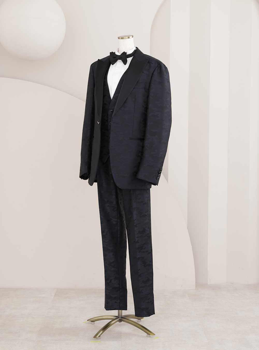 さりげないカモフラ柄が目を惹くタキシード。従来とは一線を画す上品で主張しすぎない柄が花嫁様のどんな衣装ともマッチして、おしゃれな印象にまとめることができます。着慣れたブラックが良いけど、なにか一味欲しい!そんな願いも叶えます☆個性的すぎるのはちょっと・・・だけど他とは被りたくない・・・そんな方におすすめの1着です!