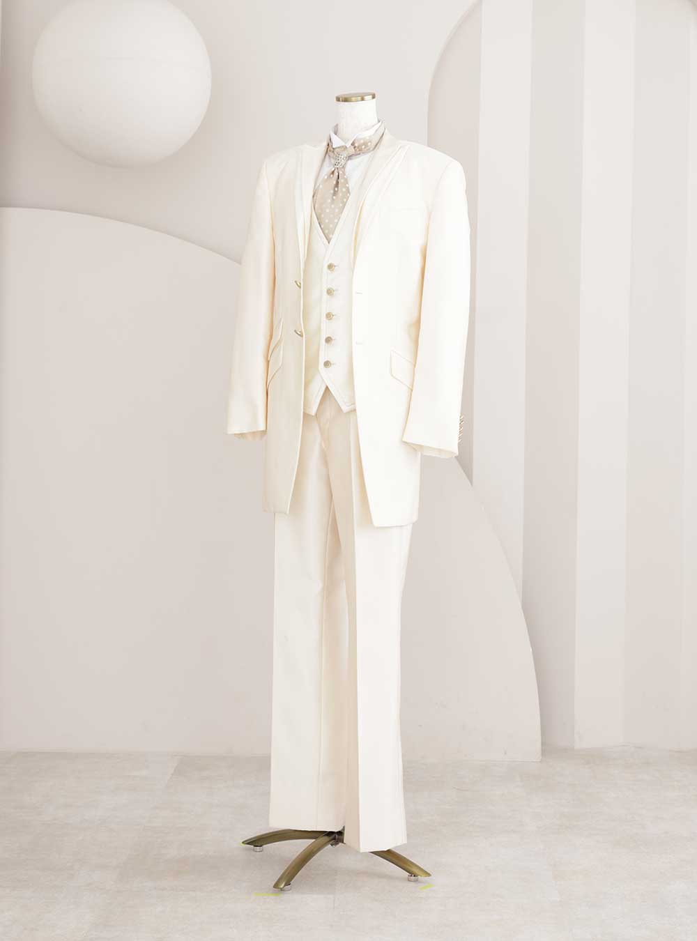 ジャケットのVゾーンを高めにしたことで足元を長く見せるロングタキシードコントラストをつけない同系色で上品な色でまとめました。さりげないアクセントのドット柄のネクタイで華やかさを演出し腰のスラントポケットは細身に見える効果がありスタイリッシュに着こなせます。チェンジポケットで王道の中に個性も出したい方におすすめです。