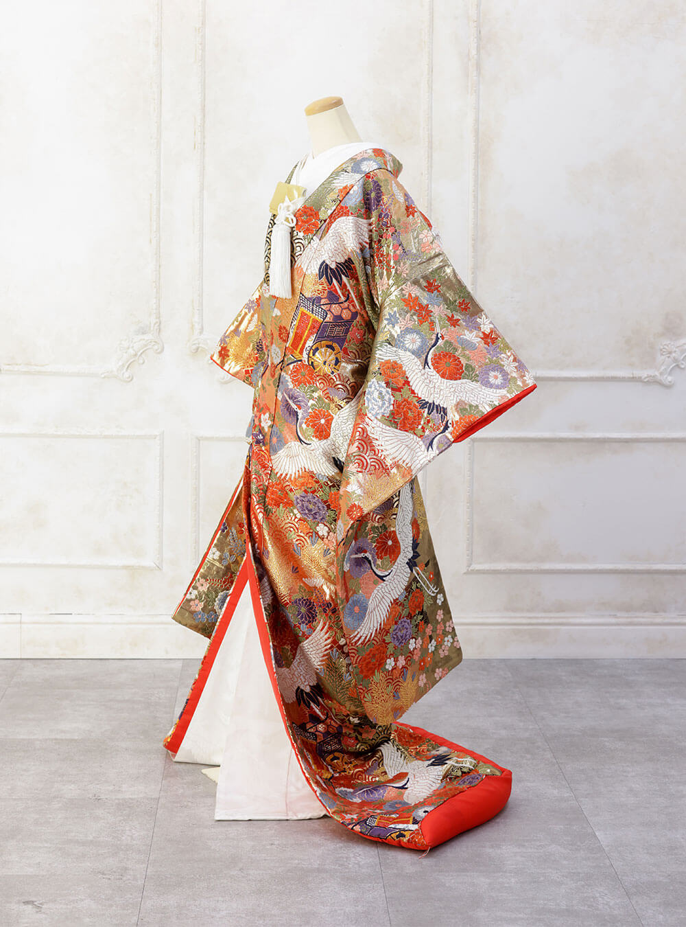 深めのゴールドから裾にかけて赤のグラデーションになっている、重厚感のある打掛です。刺繍が多く施されていて、とても豪華なデザイン。御所車は牛車の事で、見た目通り「華やか」という意味や、貴族が乗っていた事から「富」といった意味を持ちます。大きな鶴と御所車、菊や椛の刺繍で埋め尽くされたこちらの打掛は和装ウェディングのイメージにピッタリの一枚。