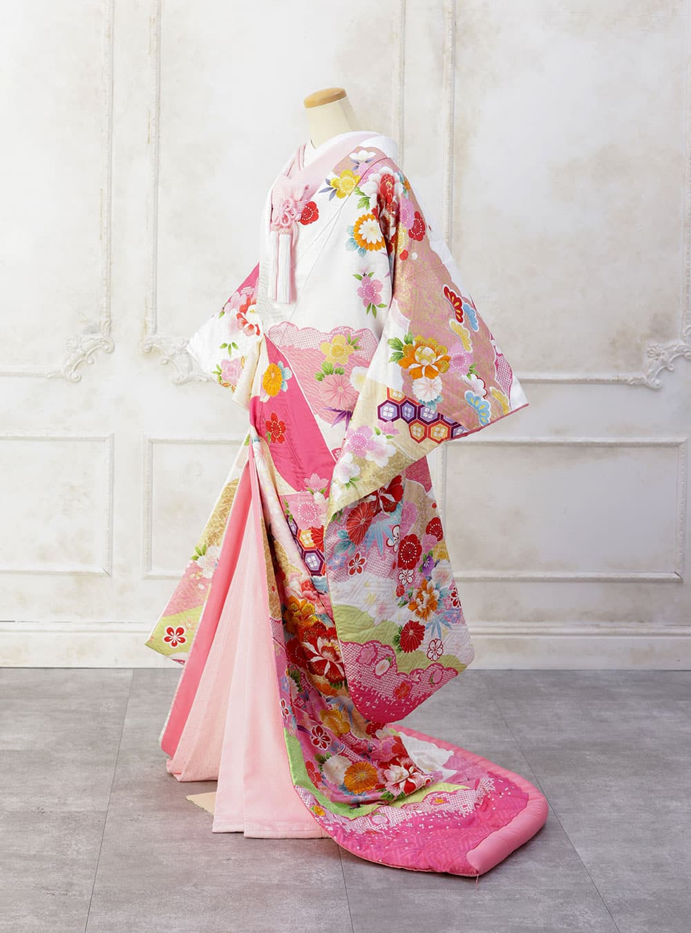 コロンとしたフォルムの花々が和の愛らしさ満点な色打掛。 白地に可愛らしいピンクカラーをふんだんに用いて、さらに色とりどりの花々がまるで日本の和菓子のような美しさ。 掛下もピンクカラーでとことん可愛さを追求した色打掛は、花嫁の気分も明るく楽しくしてくれます。 洋髪との相性も良く、タイトな落ち着いたヘアで上品に仕上げても良し、ゆるふわヘアで甘めのかわいいコーディネートに仕上げるのもおすすめです。