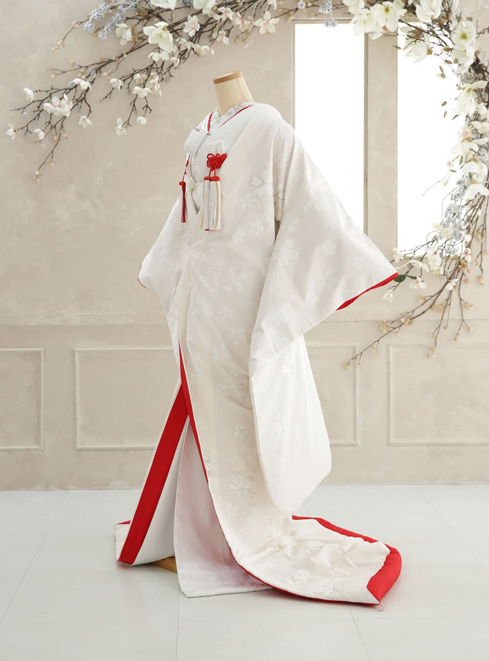 白地に鮮やかな配色の花々。長春花の別名をもつバラが大輪の花を咲かせ、幸福感いっぱいの一着となっております。 白無垢と色打掛けで迷われてる花嫁様は白の色打掛もご検討ください。真っ白は少し物足りない、そんな方には可愛らしい印象の白色打掛けがおすすめです。洋髪でふんわりとしたヘアスタイリングがおすすめとなっております。