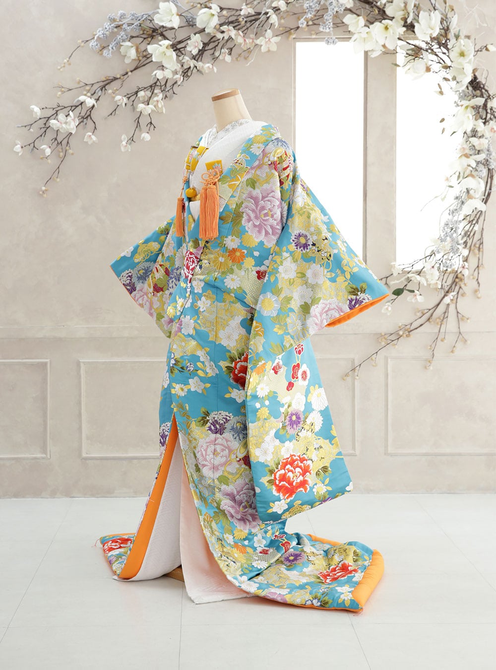 華やかなブルーに、百花の王とも呼ばれる牡丹の花をはじめ、長寿を表す菊など四季折々の花が、施されている打掛けとなっております。 鮮やかなブルーの打掛けには、無数の色や柄が使用されており華やかな衣装がお好みの方におすすめとなっております。ブルーに差し色のオレンジが効いて、より花嫁様の存在感を引き立たせる1着となっております。