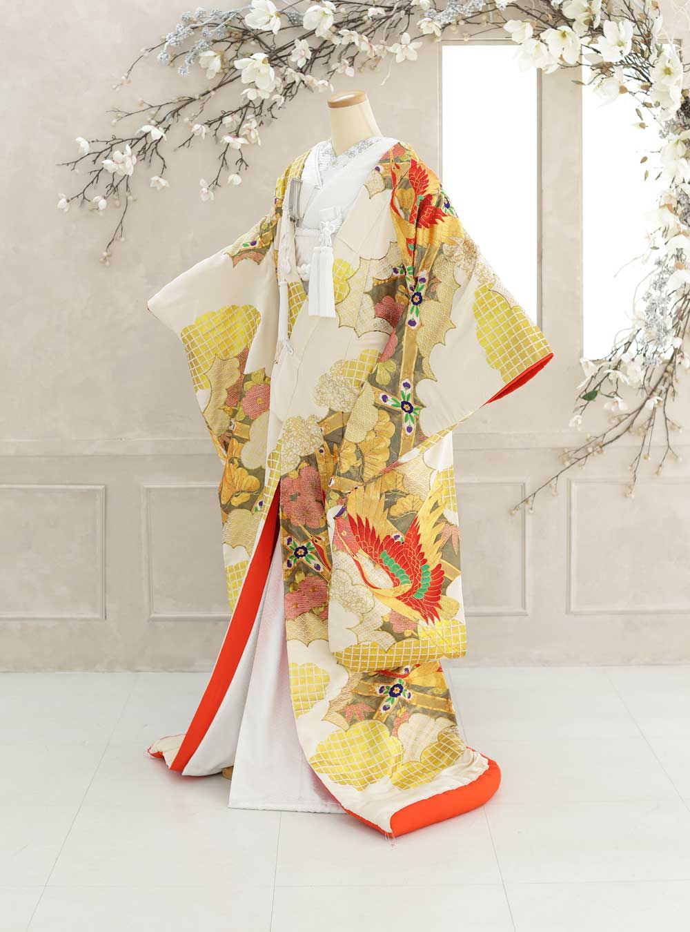まるで絵画のような活き活きとした鶴の表現が趣深く、龍や神様が住んでいるとされていた雲は、瑞祥や運気上昇のしるし、ともされている雲取模様が特徴の柄なっております。 またインパクトのあるゴールドの打掛けが、真っ白な掛下と合わさることで花嫁の清楚さを演出します。古典的な柄でタイトな和風ヘアスタイルがおすすめです。