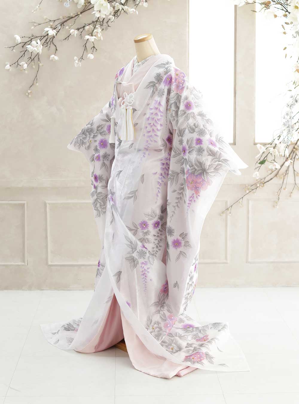 オーガンジーの透け感が軽やかな爽やかな透明感を演出します。オーガンジーならではの光沢で高級感も演出。まるで水彩画のように描かれた花々は藤の花の紫が良いアクセントになり可愛らしい印象にしてくれます。 トレンドのオーガンジーの打掛けには編みおろしなどの洋風なヘアスタイルがおすすめです。