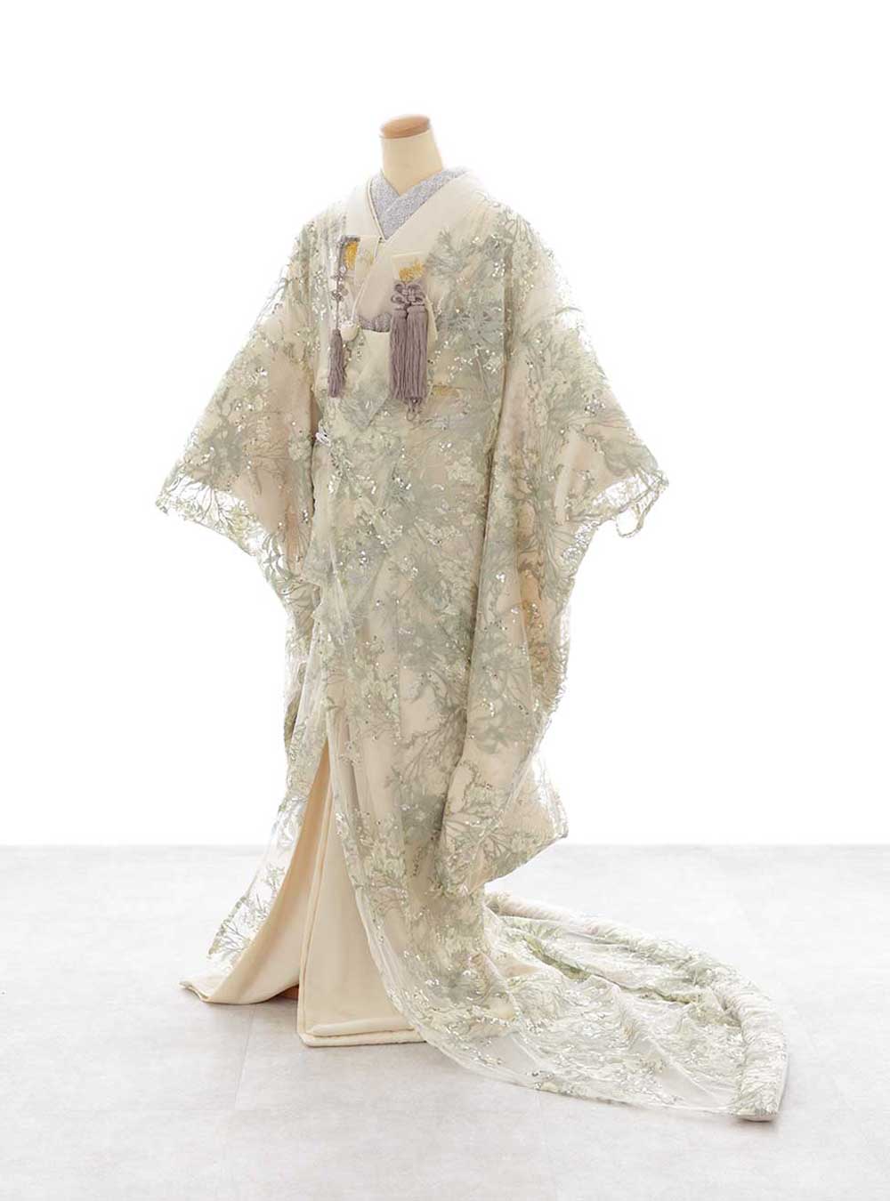 上質なドレスを身に纏ったような満足感溢れるレースの打掛!圧倒的な透明感がたまらない♡レースの打掛は肌色を問わないのもおすすめの理由!オフホワイト地に散りばめられたグリーンの花々が可愛らしさの中に純粋さを醸しだしてくれます。その上をスパンコールが彩り、より一層優艶さを演出。ゆるふわなヘアスタイルにすると可愛いのでおすすめ♡