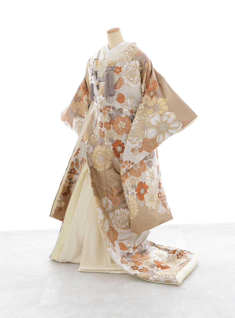 マーガレット、チューリップ、アネモネ、かすみ草など、色とりどりの花々が爛漫に咲き誇る様子が、アンティーク柄のような雰囲気に。マーガレットには「真実の愛」「優しい思い出」という意味が込められており、お二人の大切な思い出を優しく彩ってくれます。ブラウンでワントーンにまとめられたコーディネートが洗練された大人の女性を演出。お二人のお祝いのお写真をより一層お洒落に仕上げてくれます。