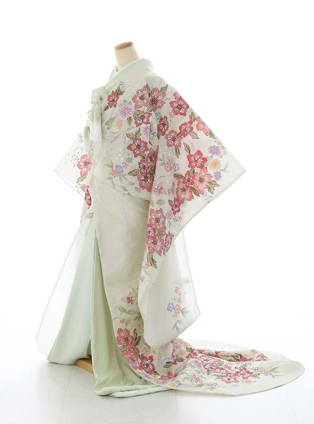 エアリーな透け感がとっても可愛い「オーガンジー和装」オーガンジーは洋装のドレスにも使用される素材でもあることから、新和装とも呼ばれています。和と洋の良さを取り入れたい方におすすめの一着。 オーガンジーから透けるグリーンが可愛らしさとフレッシュさを融合した印象に。打掛に描かれたピンクのお花と掛下のグリーンも相性バッチリ! 流行りのルーズなヘアスタイルがよりトレンド感を演出してくれるのでおすすめ。打掛にちりばめられたスパンコールがより華やかに。