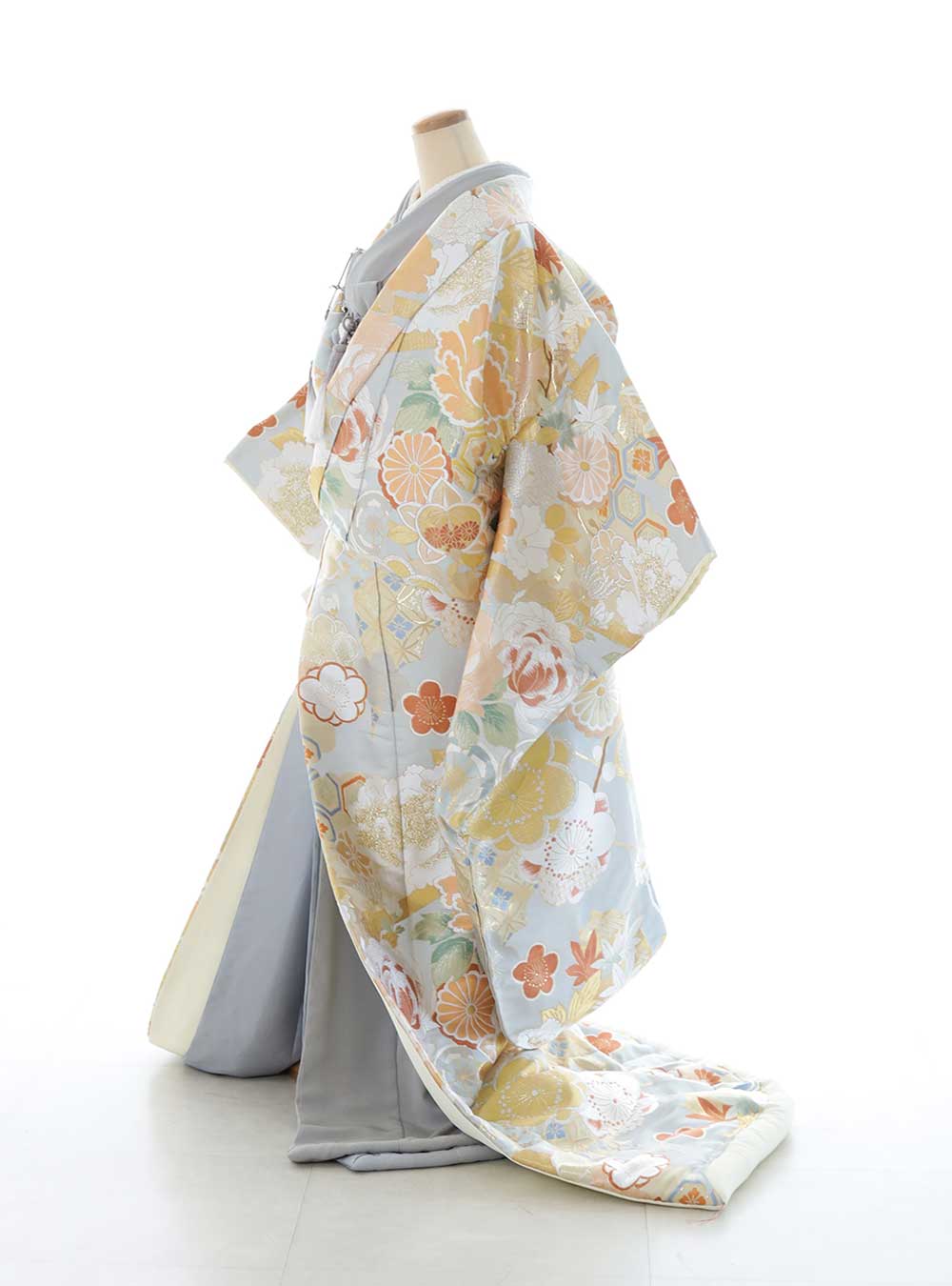 落ち着いたブルーグレーの色に花や文様を大きく、丸く、全体にデザインすることでより一層可愛らしく華やかなお衣装です。打掛の地色に合わせて掛下もグレーでまとめることで暖色の柄が映え、お肌を柔らかく明るく見せてくれます。流行りのドライフラワーの髪飾りと合わせてふわふわなヘアスタイルにするとかわいいのでおすすめです!