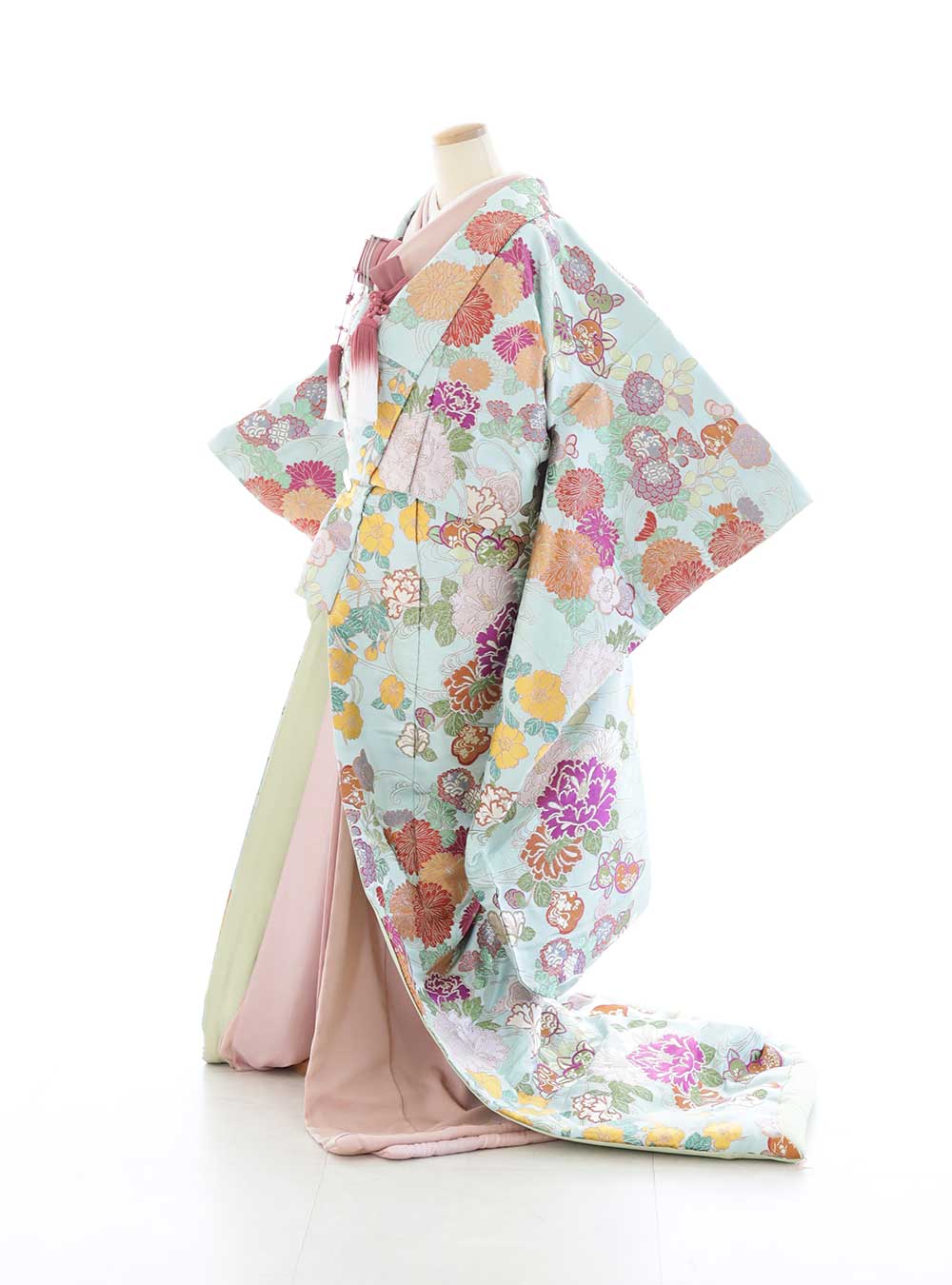 色鮮やかなスカイブルーが印象的な一着。ブルーの上に咲く、温かみのある花々が優しい印象にしてくれます。大きな花びらが印象的な牡丹には、「幸福」「富貴」といった意味が込められています。花々の色味に合わせた優しいピンクの掛下がかわいらしくお二人の幸せオーラを包んでくれます。流行りのドライフラワーの髪飾りとも相性抜群!!