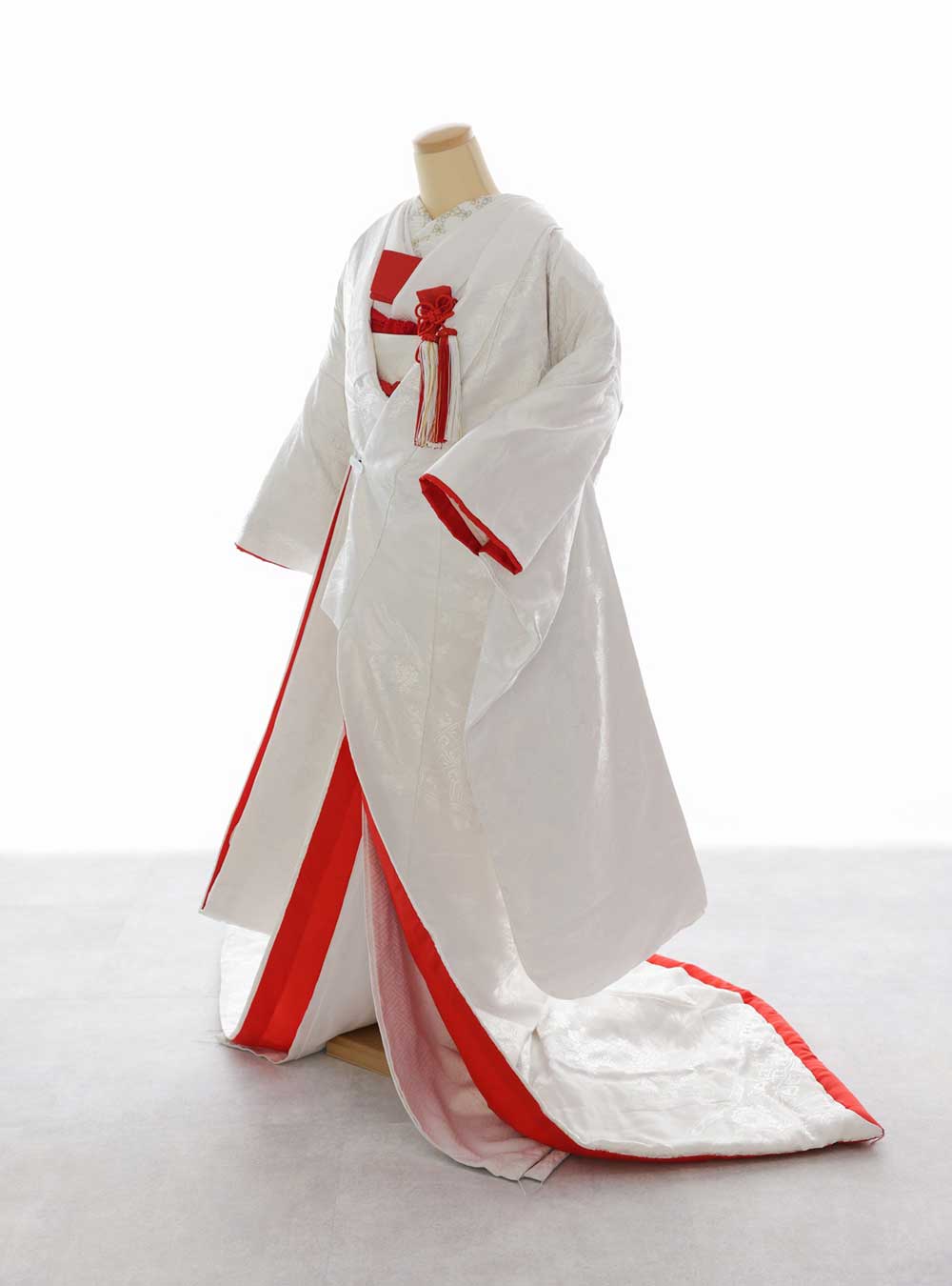 真っ白に差し色の赤が印象的な白無垢です。裾に入った鮮やかな赤の存在感がカッコ良さを引き立てくれます。赤のラインは真っ白な王道の白無垢よりも重厚感が出るので、黒の羽織袴と合わせるとよりシックな雰囲気になり、綿帽子を合わせても素敵です。小物も赤で統一していて、とてもお洒落なコーディネート。しっかり和髪で仕上げてもかっこいいです。