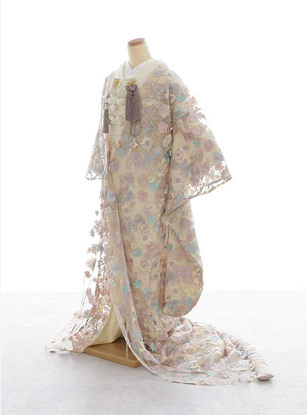 透け感のあるオーガンジー素材の色打掛。洋風の雰囲気を纏ったオーガンジーの打掛は和と洋の良さ、どちらも取り入れた贅沢な一枚。今までの打掛とは違った雰囲気の上品さがあり、ブルー・ピンク・ホワイトの刺繍が華やかさと可愛らしさをプラスしてくれます。オーガンジーの下にアイボリーの掛下を合わせているので、柔らかい雰囲気がお好きな方におすすめのコーディネートです。