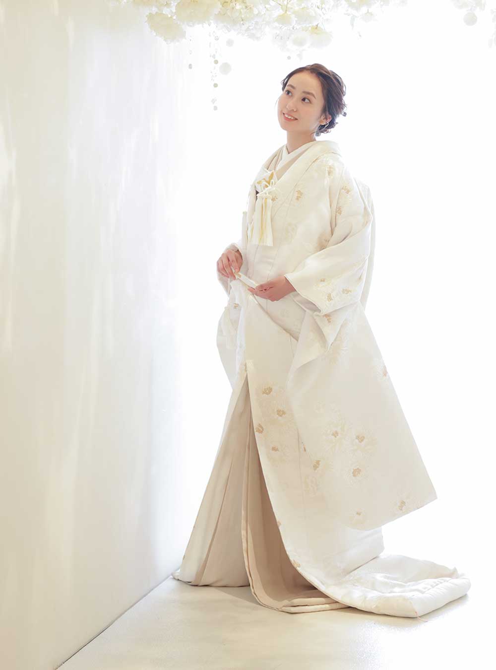 白無垢にベージュの掛下を合わせた、可愛らしさと上品さを兼ね備えた1枚です。オールホワイトで古典的なイメージが強い白無垢ですが、合わせる掛下のカラーやデザインによって白無垢姿を現代的でモダンな印象を与えます。散りばめられた花の刺繍が愛らしい印象を持ちつつも落ち着きのある上品な“オトナカワイイ”を演出します。