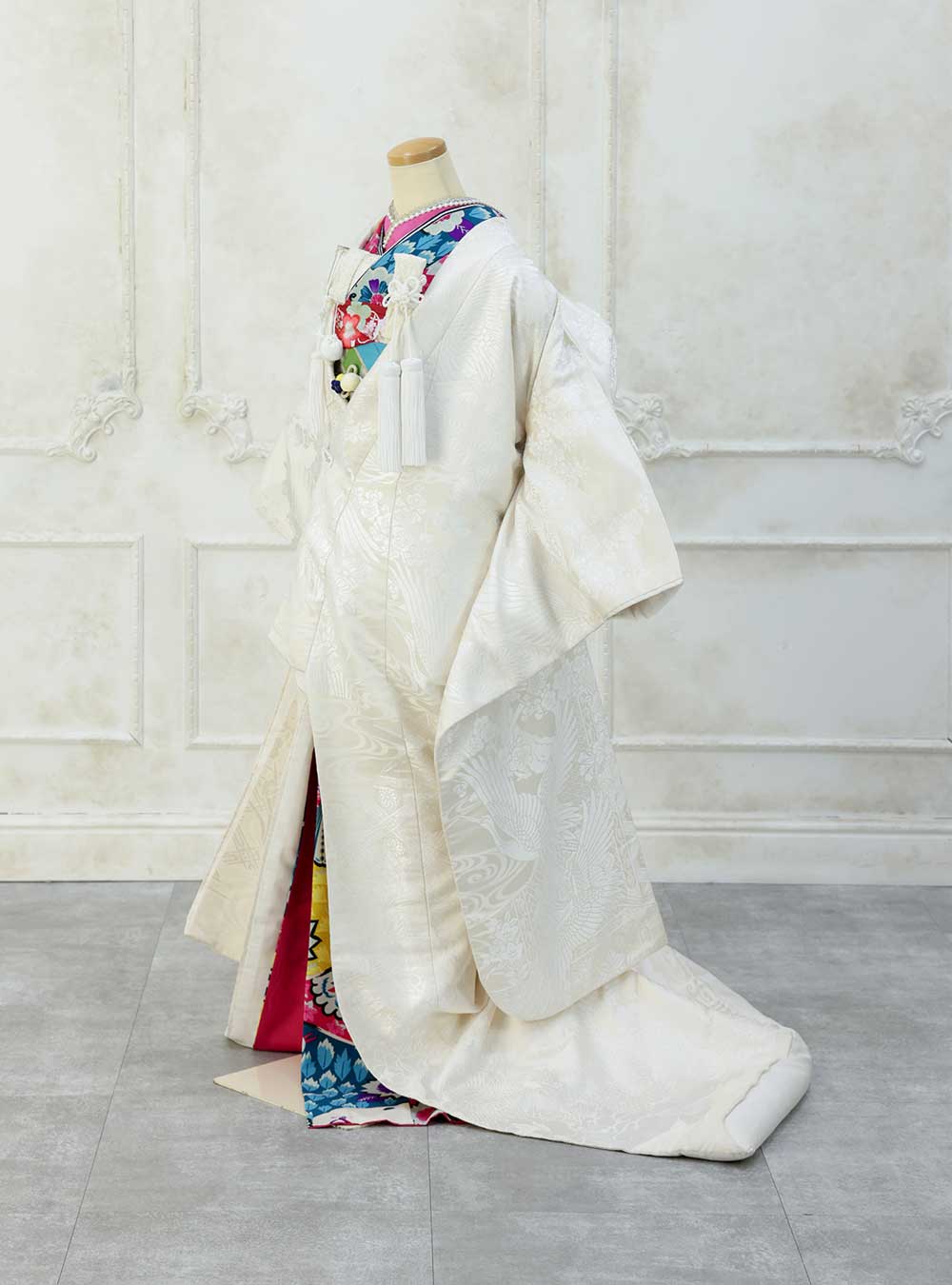 日本で古くから用いられてきた婚礼衣装の白無垢。 伝統的な衣装にあこがれる一方でやや古い印象を持っている方もいるのではないでしょうか? 自分らしく個性も出しつつ伝統着物を楽しみたい方のために、デザインの入った掛下も増えています。 こちらはレトロモダンなカラーリングが華やかな掛下です。 淡い色より、引き締まるビビットなカラーがお好みの方におススメです。