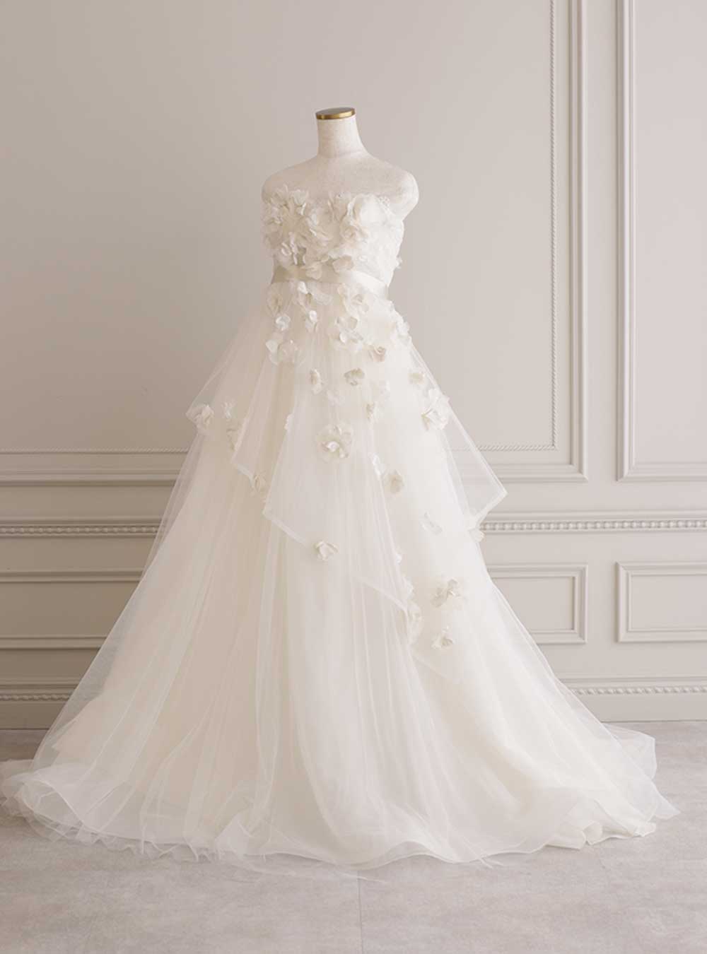 立体感のあるお花のデザインの新作ドレス。拘りのディテールが素敵なデザインです。高い位置に切り返しがついているので、マタニティの方にも対応出来ます。デザイン性もあって、とても可愛い雰囲気のドレスです。お花がコンセプトの西宮店の背景にぴったりな、目を引くデザイン。ヘアスタイルはふんわりとしたスタイルがオススメです。
