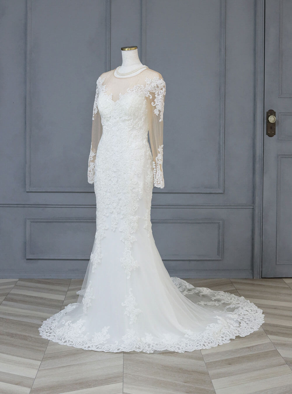 お袖がベージュのオーガンジーで大人っぽいデザインのマーメイドドレスです。お袖がベージュなのはこの一点のみ。肩と手首だけに刺繍が入っていて、程よい透け感です。大きめで立体的な刺繍が裾までしっかり入ったデザインで、トレーンも後ろが長く縁のレースも豪華なデザインなので、バックショットも素敵に撮影させて頂きます。