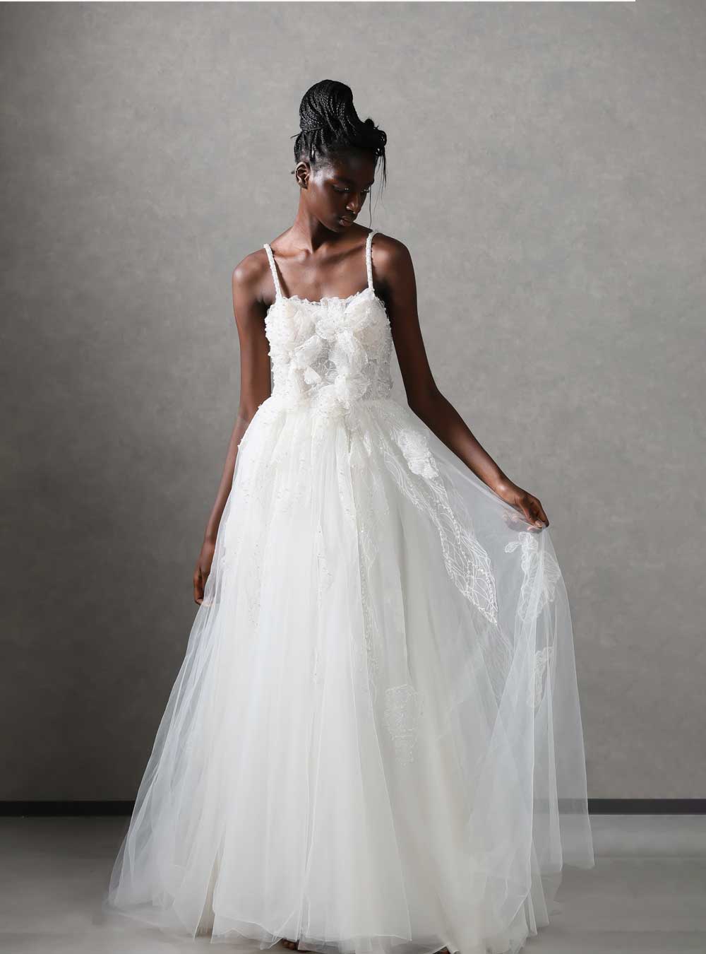 軽やかなチュールと繊細なレースが魅力的な一着です。チュールに施された刺繍と胸元を飾るレースが上品で可憐な印象を与えてくれます。散りばめられたパールは角度が変わる度にドレス全体がキラキラと輝き、ロマンティックな雰囲気を演出します。シンプルなストラップがデコルテラインを美しく見せ、より軽やかで透明感溢れるデザインとなっています。