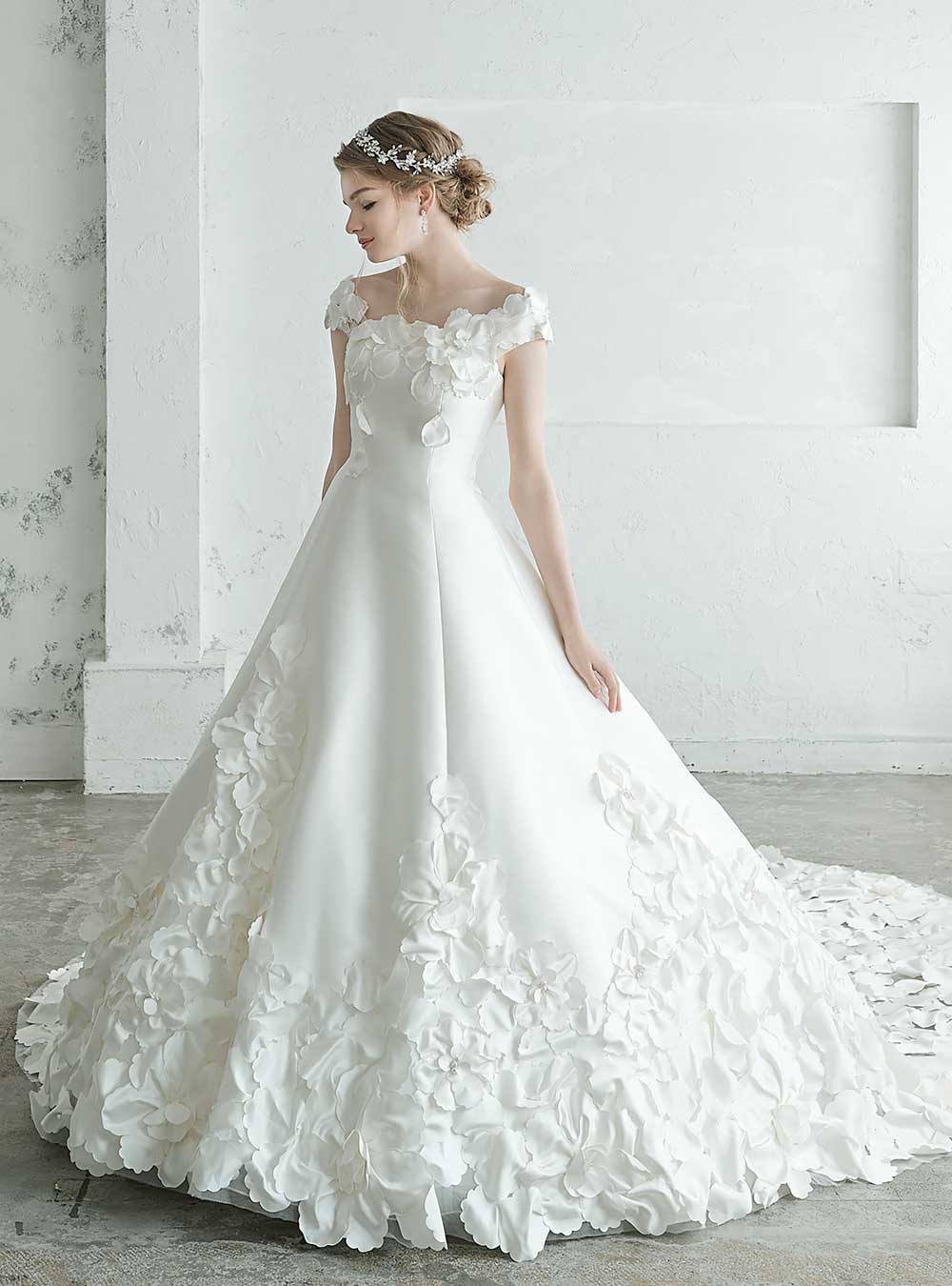 花びらのモチーフが可憐な印象を与える一着です。胸元と裾にふんだんに施された立体的な花のモチーフがまるで満開の花々に包まれているかのようなロマンティックな雰囲気を演出します。オフショルダーのデザインが肩やデコルテラインを美しく見せ、清楚で可憐な印象の中にも優雅で大人の魅力をプラスしています。マルチwayドレスの為、ビスチェデザインにすれば上品でより華やかな印象を与えてくれます。